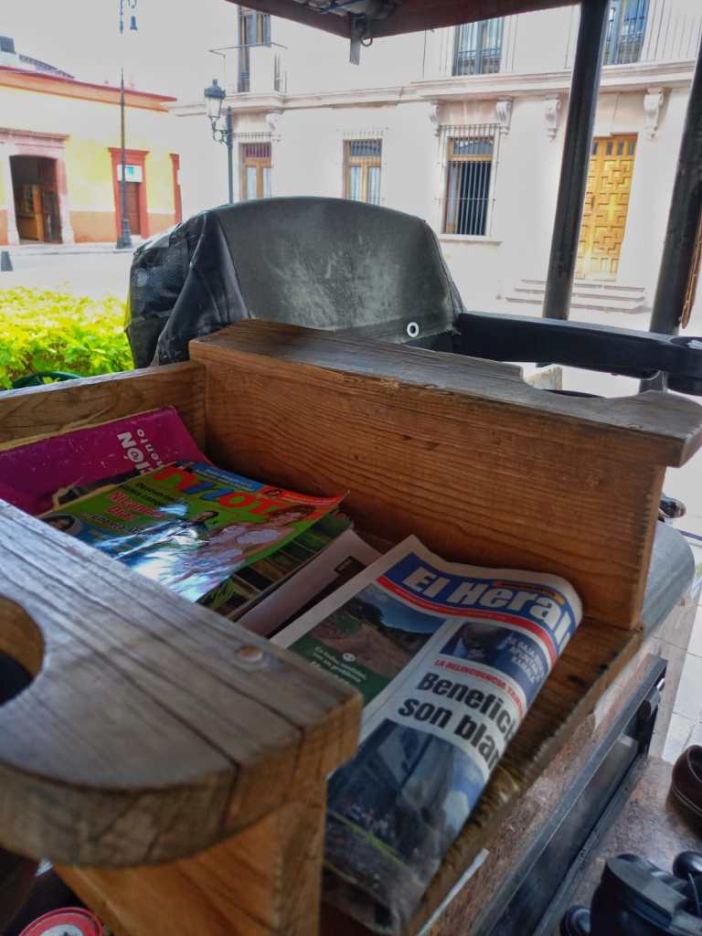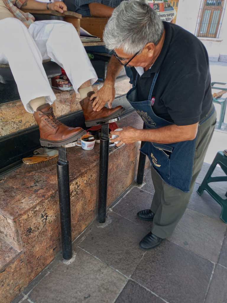 Don Mario: Sí, en este oficio es al día y todo depende de cuántos clientes atendamos. No hay sueldo fijo, ni horarios garantizados: lo que ganas es lo que trabajas. Por cada cliente cobro entre 20 y 30 pesos, a veces un poco más si es un trabajo especial o si me piden lustrar botas que llevan más tiempo y material. En un buen día puedo atender a unos 10 o 15 clientes, pero hay días flojos en los que apenas hago para comer y pues hay que considerar también el costo de los materiales.