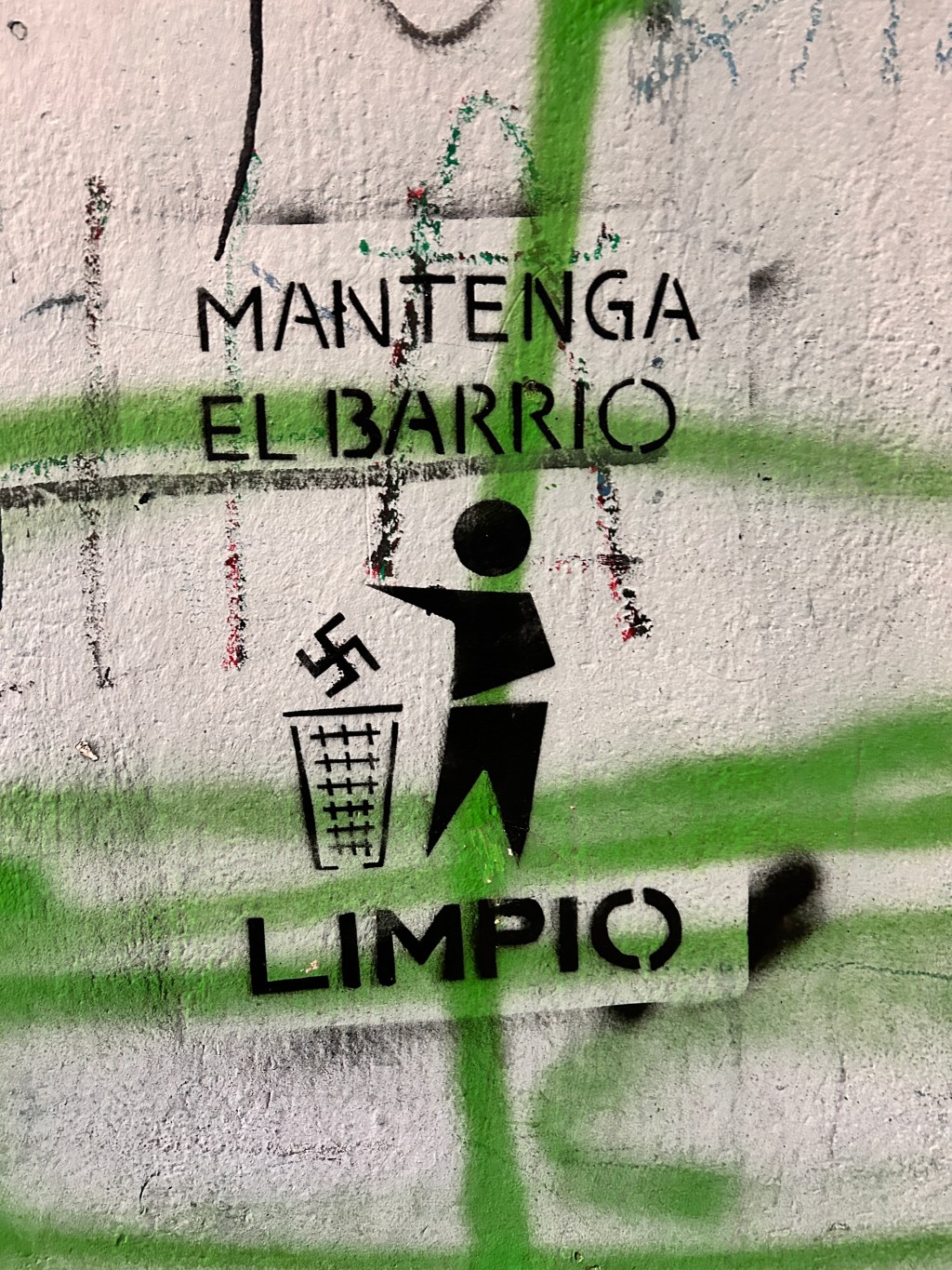 Es entonces labor nuestra mantenernos firmes en esos derechos ganados porque ser distinto a lo occidental es vivir siempre alerta, pero eso es mejor a vivir distraídos y dejar de vivir pronto. Los porteños tratan de salir adelante con esa batalla que perdieron y en las calles se atisba esperanza en forma de grafitis: Israel nazi, somos más estudiantes que milicos, mantén el barrio limpio de nazis son las pruebas de que ese adolescente mirándome con odio en los baños del Teatro Alvear, es un oprimido, una víctima de esa doctrina hegemónica fortalecida con una crisis económica que se refleja en la ropa conservadora y usada, el peso devaluado y los costos poco accesibles. Cuando una sociedad se va quedando sin nada se aferran con fuerza a su color de piel, se inventan una cualidad heterosexual de machos y recuerdan una historia gloriosa que quizá ni existe. Me vuelvo a querer por ser yo, aún me queda mucha libertad.